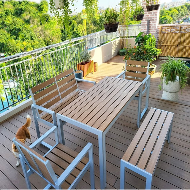 Làm từ gỗ tự nhiên (gỗ teak, gỗ sồi, gỗ keo, gỗ thông...) hoặc gỗ nhựa ngoài trời (WPC) – thân thiện môi trường, không gây hại sức khỏe.