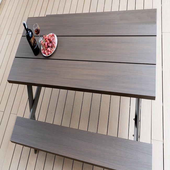 - Bề mặt làm bằng vật liệu gỗ nhựa composite chịu nước và chịu được thời tiết khắc nghiệt ngoài trời, bền theo năm tháng