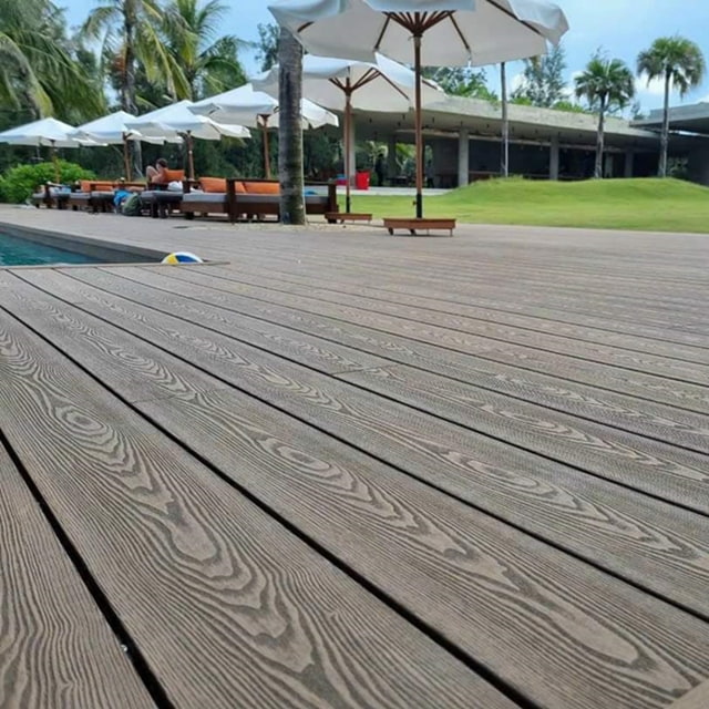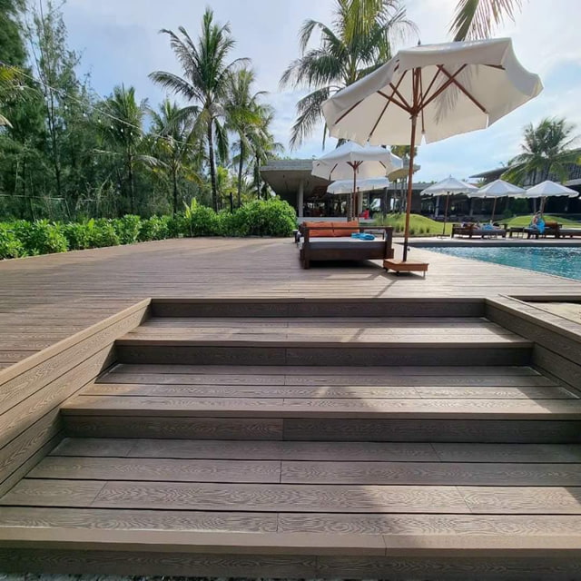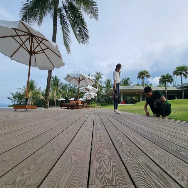 Sàn gỗ nhựa ngoài trời (WPC – Wood Plastic Composite) là loại vật liệu lát sàn cao cấp, được tạo thành từ hỗn hợp bột gỗ tự nhiên, hạt nhựa PE và phụ gia chuyên dụng. Nhờ khả năng chịu nắng mưa, chống mục nát và chống trơn trượt, sàn gỗ nhựa là lựa chọn lý tưởng cho các khu vực ngoài trời như sân vườn, hồ bơi, ban công, lối đi…Loại sàn này vừa giữ được vẻ đẹp mộc mạc của gỗ, vừa có tính bền bỉ vượt trội của nhựa, giúp không gian sống trở nên hiện đại, gần gũi thiên nhiên và bền vững với thời gian.