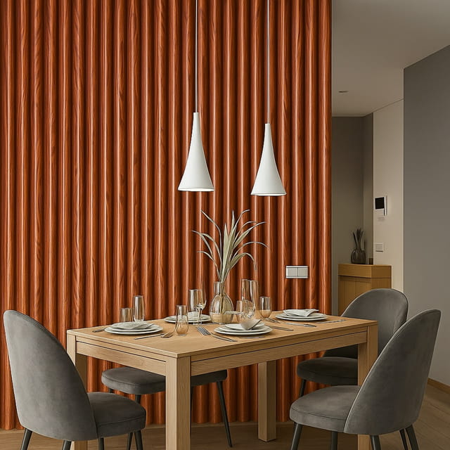 Tấm nhựa ốp tường lam sóng dương là dòng vật liệu trang trí nội thất với thiết kế đặc trưng: các rãnh lõm đều nhau, tạo nên hiệu ứng chiều sâu mạnh mẽ và sự cuốn hút thị giác. Khác với lam sóng dương (gồ lên), lam sóng âm có các khe rãnh lõm xuống như “rãnh hút ánh sáng”, mang lại vẻ đẹp thanh lịch, hiện đại và có chiều sâu cho không gian sống.