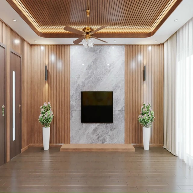 Phòng khách là "bộ mặt" của ngôi nhà. Sử dụng tấm ốp PVC vân đá giúp tạo điểm nhấn sang trọng, đẳng cấp mà vẫn giữ được sự ấm cúng. Các mẫu vân đá trắng, vân marble hay vân đen tia chớp thường được dùng để làm vách TV, tường sau sofa hoặc vách trang trí đối diện cửa chính.