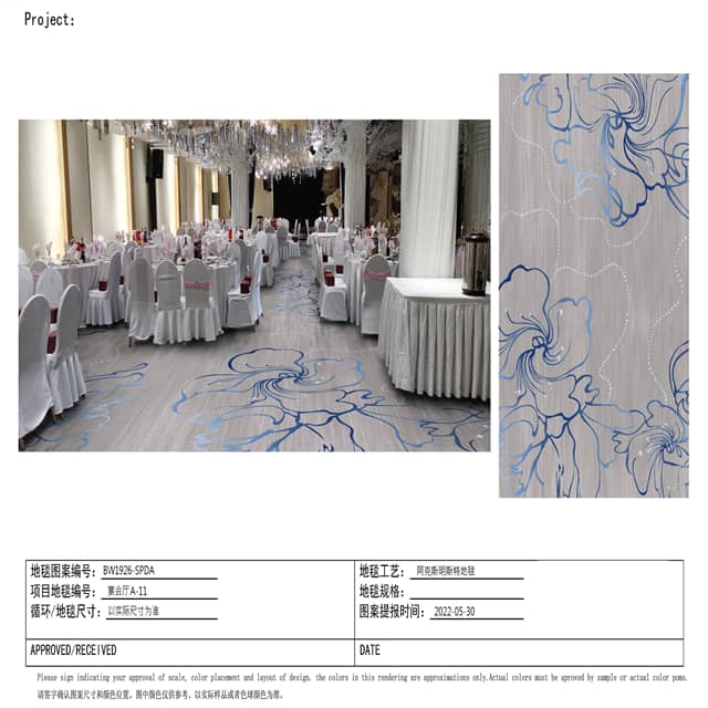 | Hình thức mua hàng: | Thảm dự án đặt hàng theo hoa văn và màu thiết kế khách hàng yêu cầu |