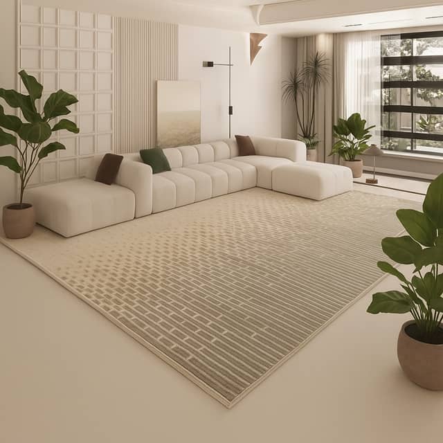 Thảm dệt 3D được làm từ các chất liệu cao cấp như sợi polyester, đảm bảo độ bền lâu dài và khả năng chịu lực tốt. Chất liệu này giúp thảm trang trí không bị bám bụi, dễ dàng vệ sinh, đồng thời duy trì sự sạch sẽ cho không gian sống của bạn. Bề mặt thảm tạo ra sự mềm mại, còn lớp đế chắc chắn giúp thảm lót sàn bám vững trên sàn mà không bị trượt, rất an toàn cho gia đình có trẻ nhỏ và người cao tuổi. Độ bền của thảm phòng khách Kanso có thể kéo dài lên đến 7 năm, đảm bảo chất lượng sử dụng lâu dài.
