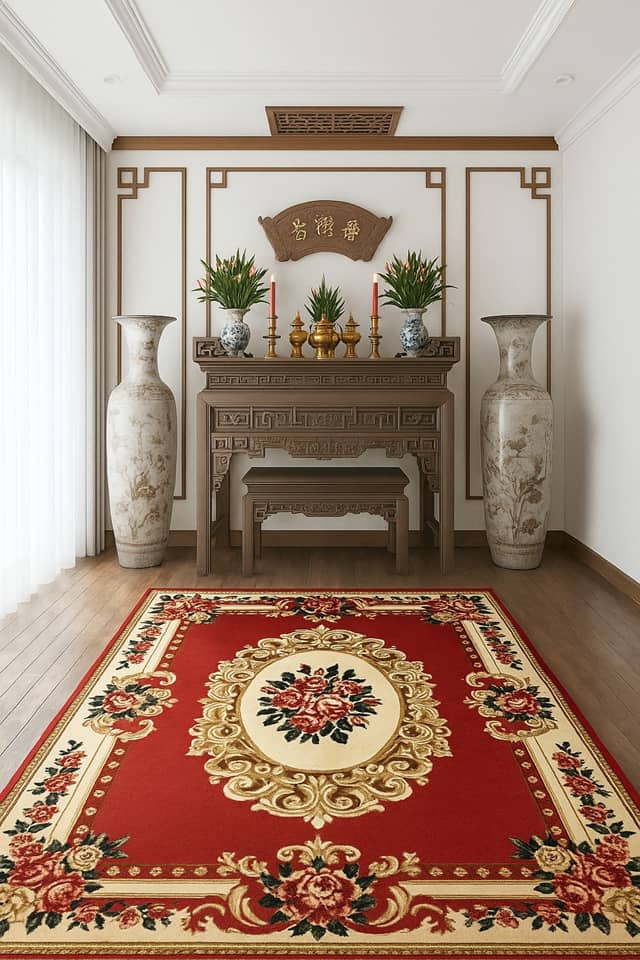 Tăng tính thẩm mỹ: Các mẫu thảm cổ điển có màu đỏ đô, vàng nhung, nâu trầm… giúp phòng thờ trở nên sang trọng, đẳng cấp.